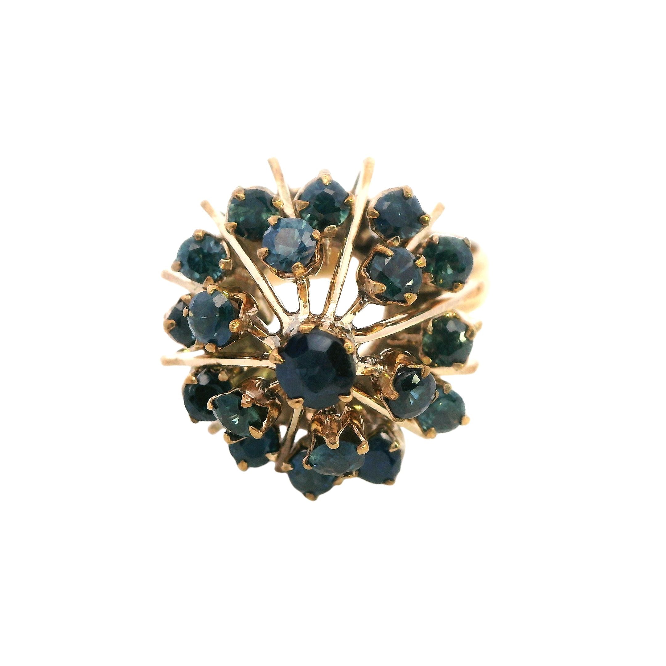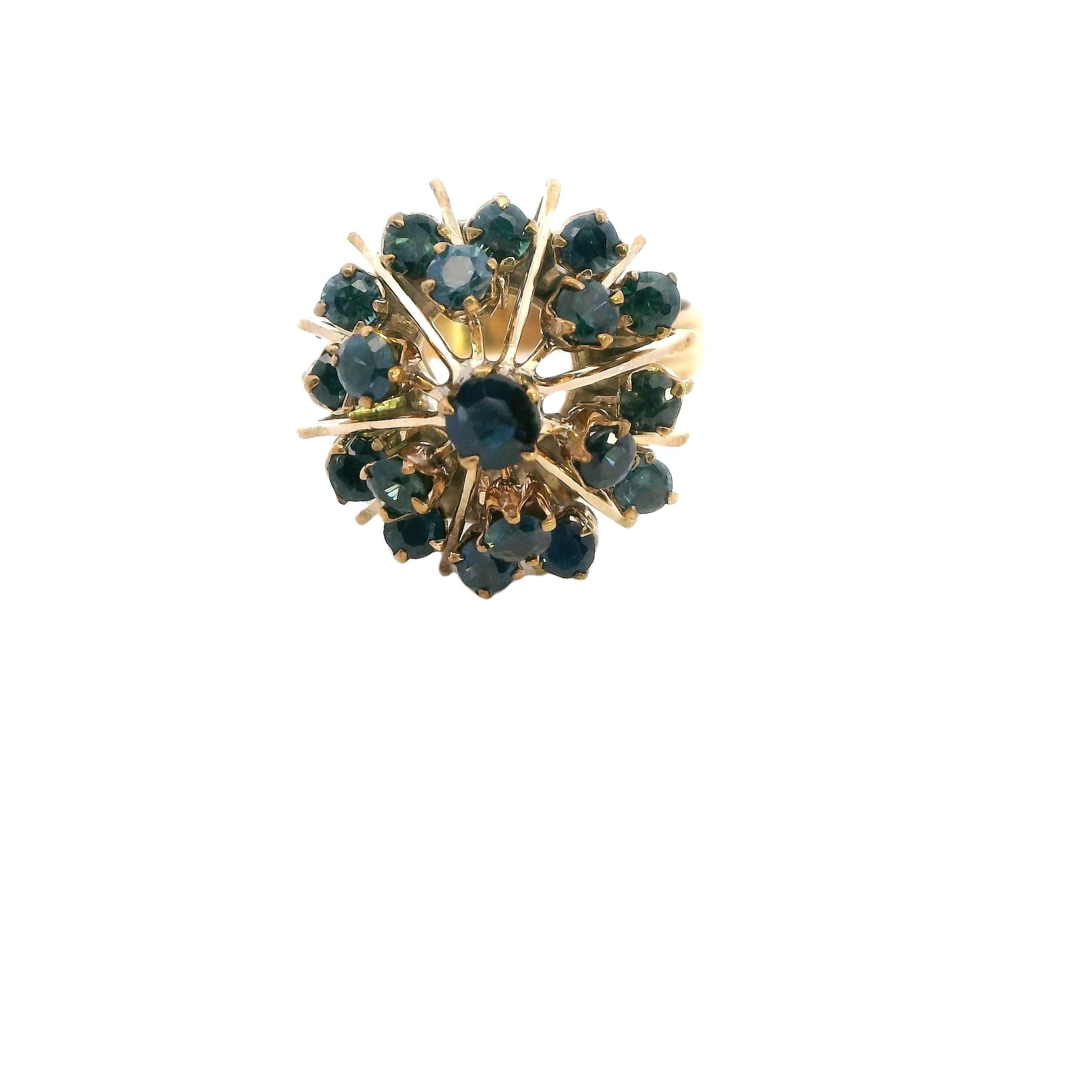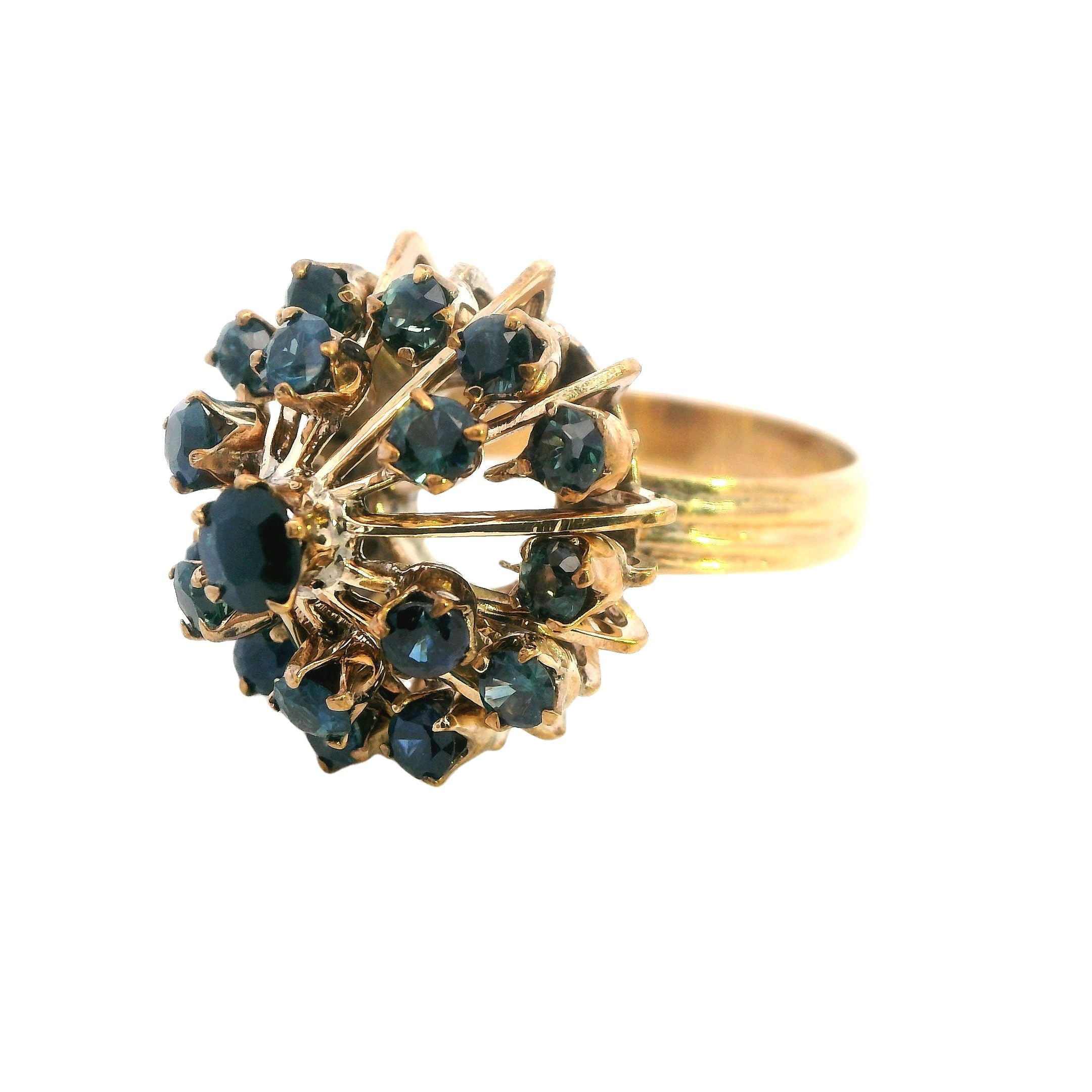 This stunning 14ct yellow gold sapphire ring is a striking piece of craftsmanship and elegance, ideal for any jewellery lover or collector. The ring features a beautiful 17.9mm round tiered mount, claw-set with a captivating array of sapphires. At its center is a 3.75mm sapphire, surrounded by eighteen 2.25mm round-cut sapphires, creating a dazzling display of rich blue hues that catch the light beautifully.