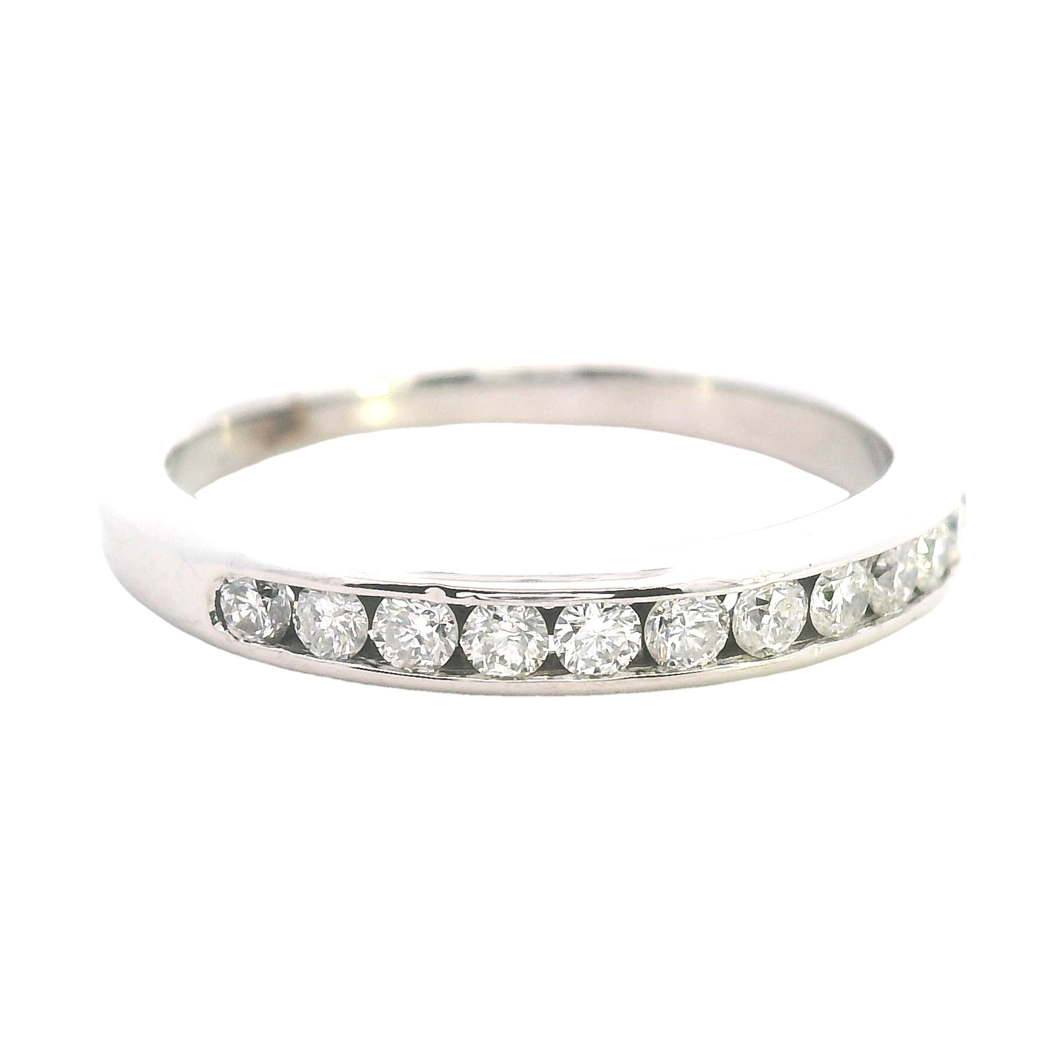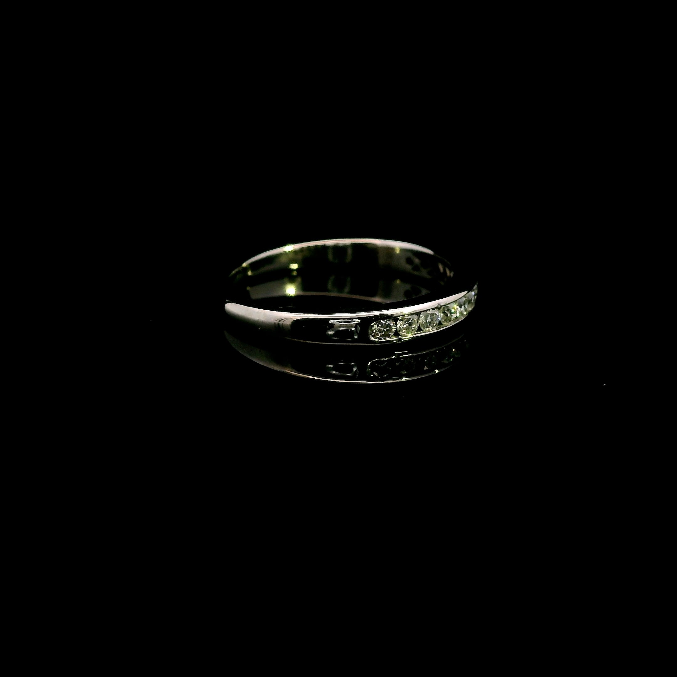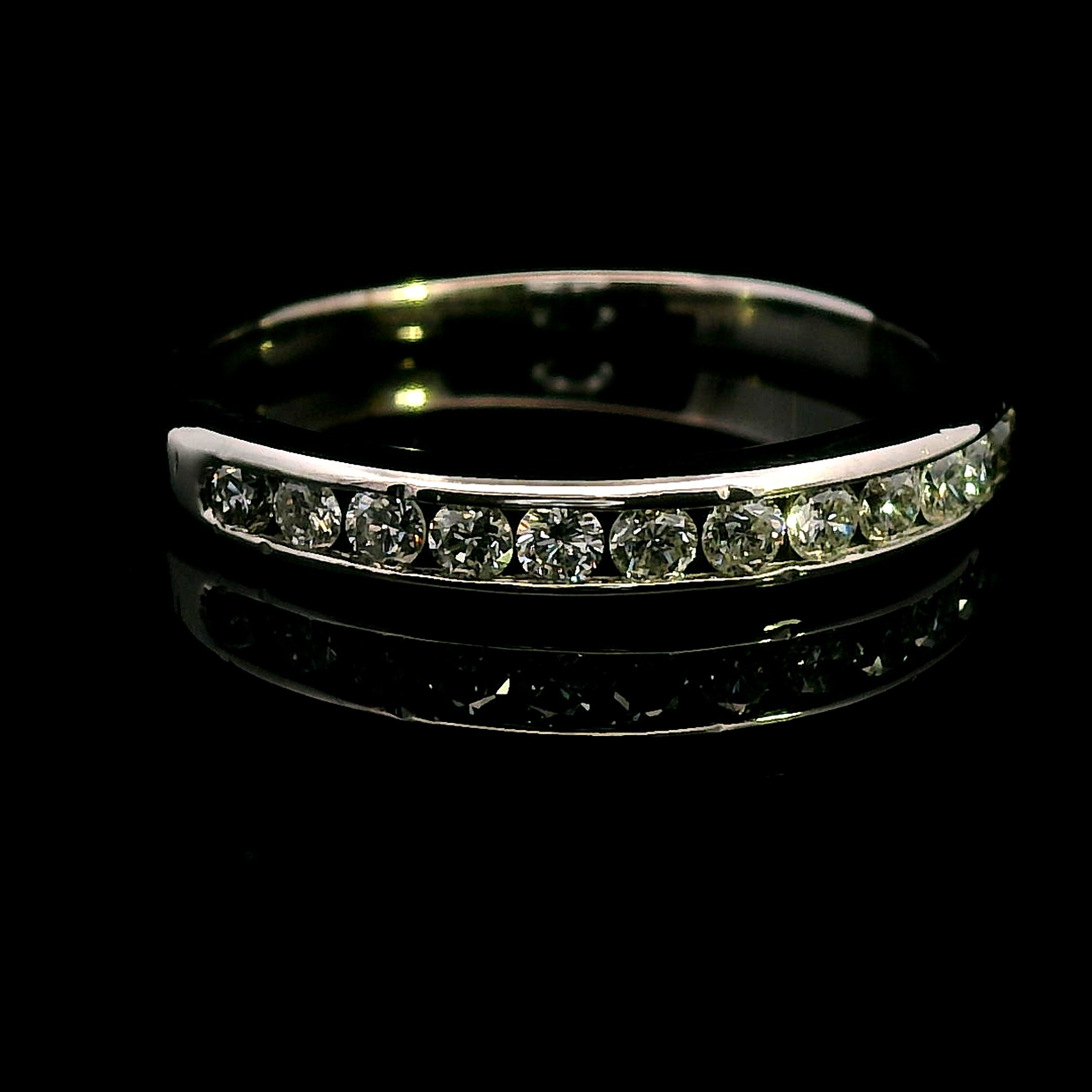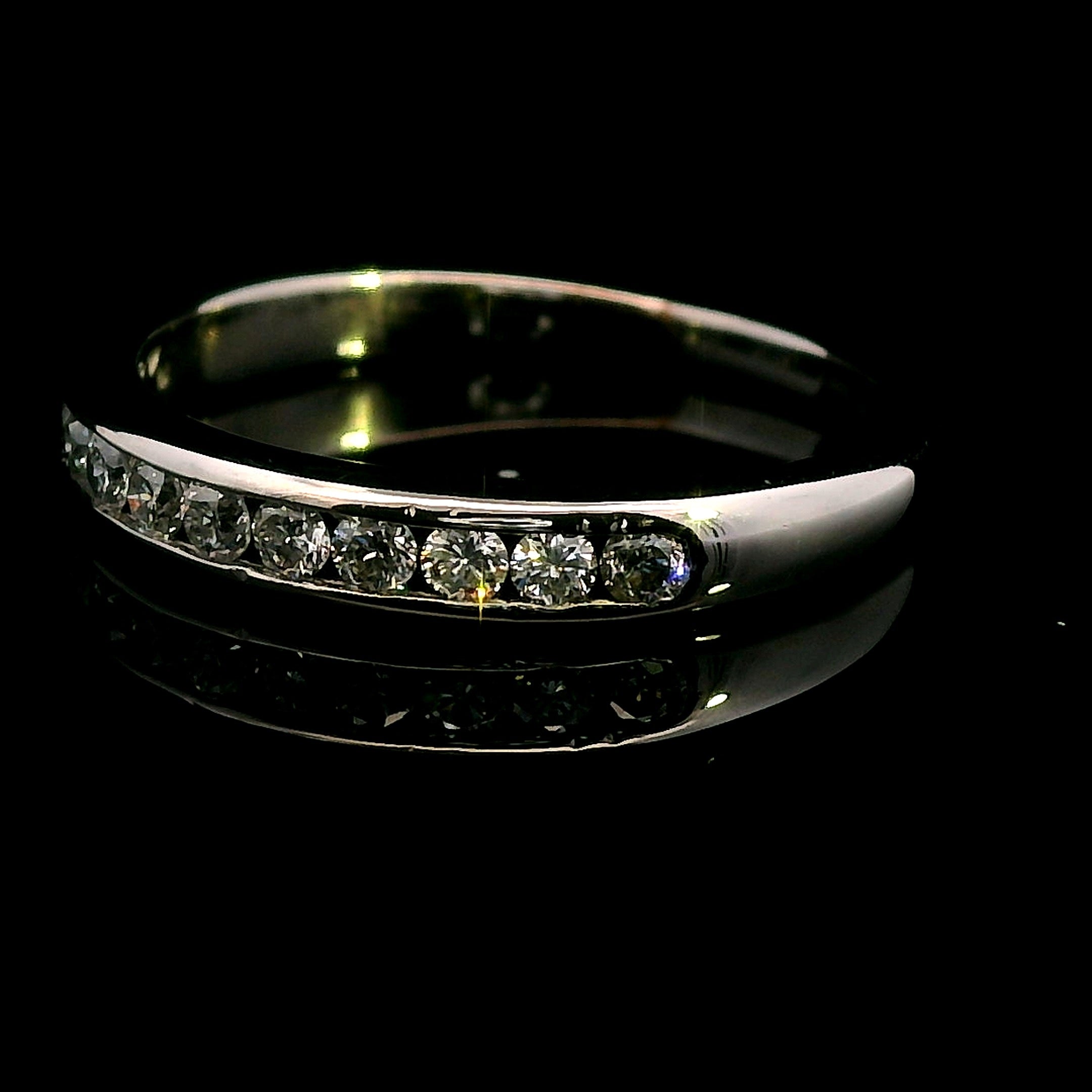 An elegant and refinedΒ 9ct white gold diamond ring, perfect for aΒ wedding band, anniversary gift, or stacking ring. TheΒ 12 dazzling diamondsΒ are channel-set in a sleek and sophisticatedΒ half-round band, making this piece a timeless treasure.