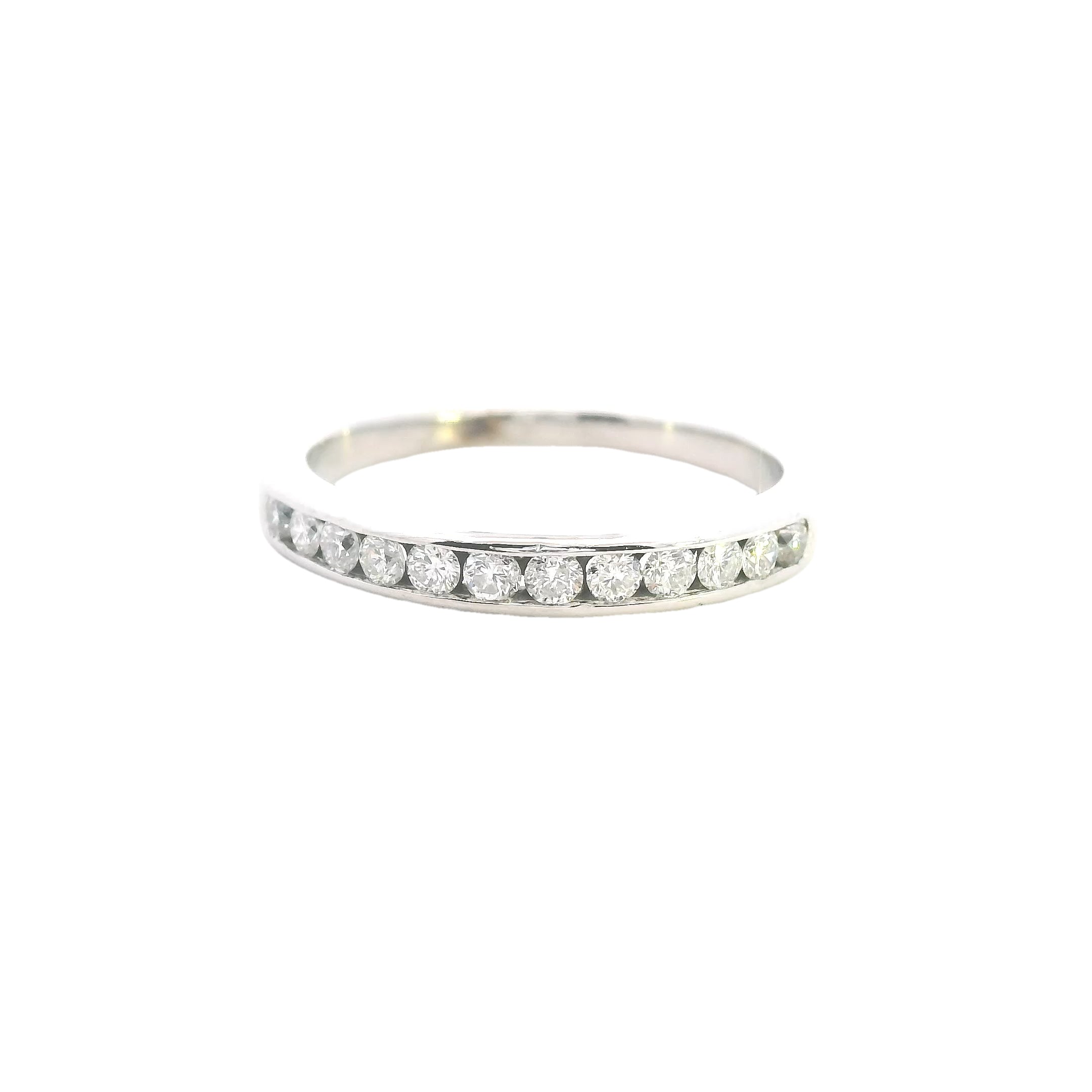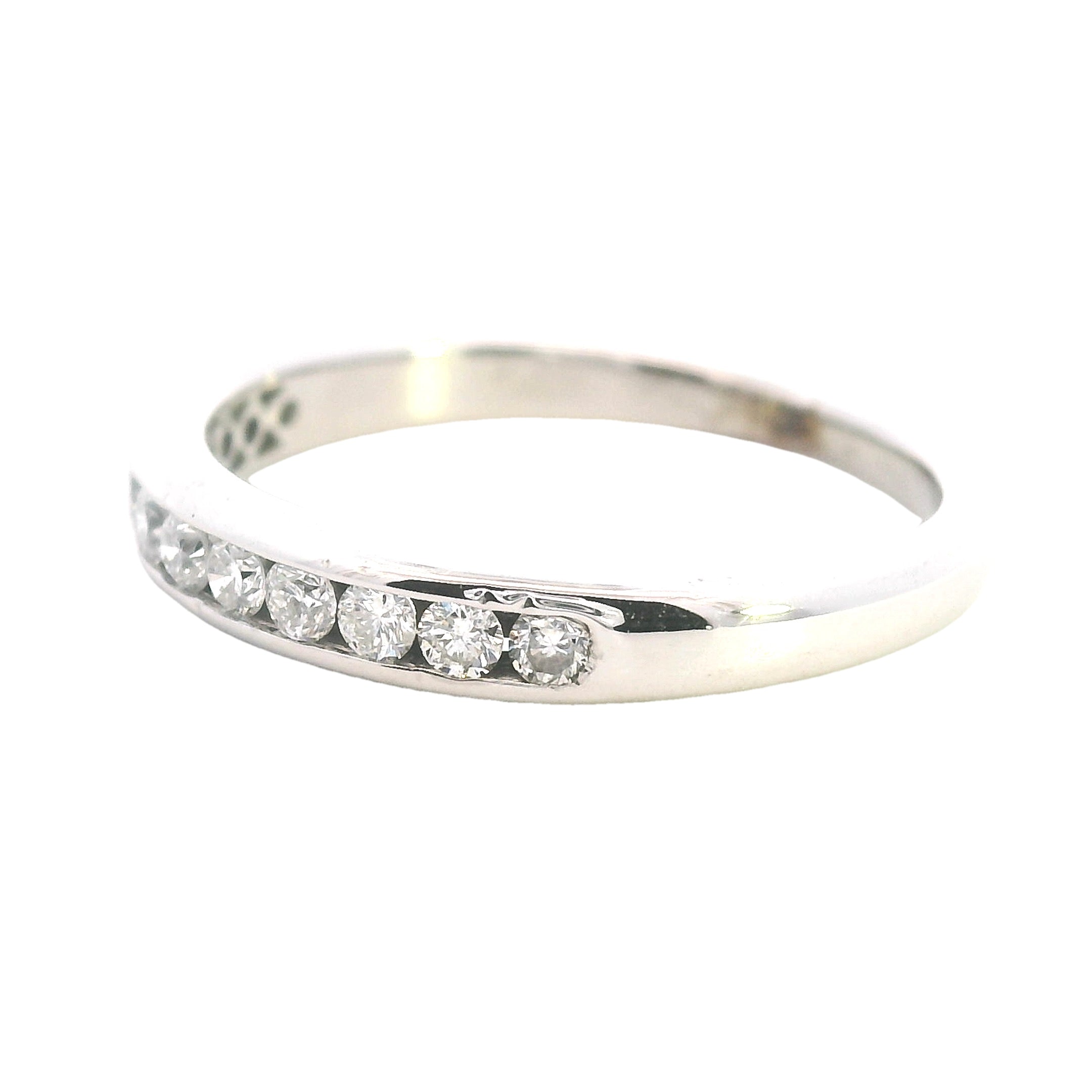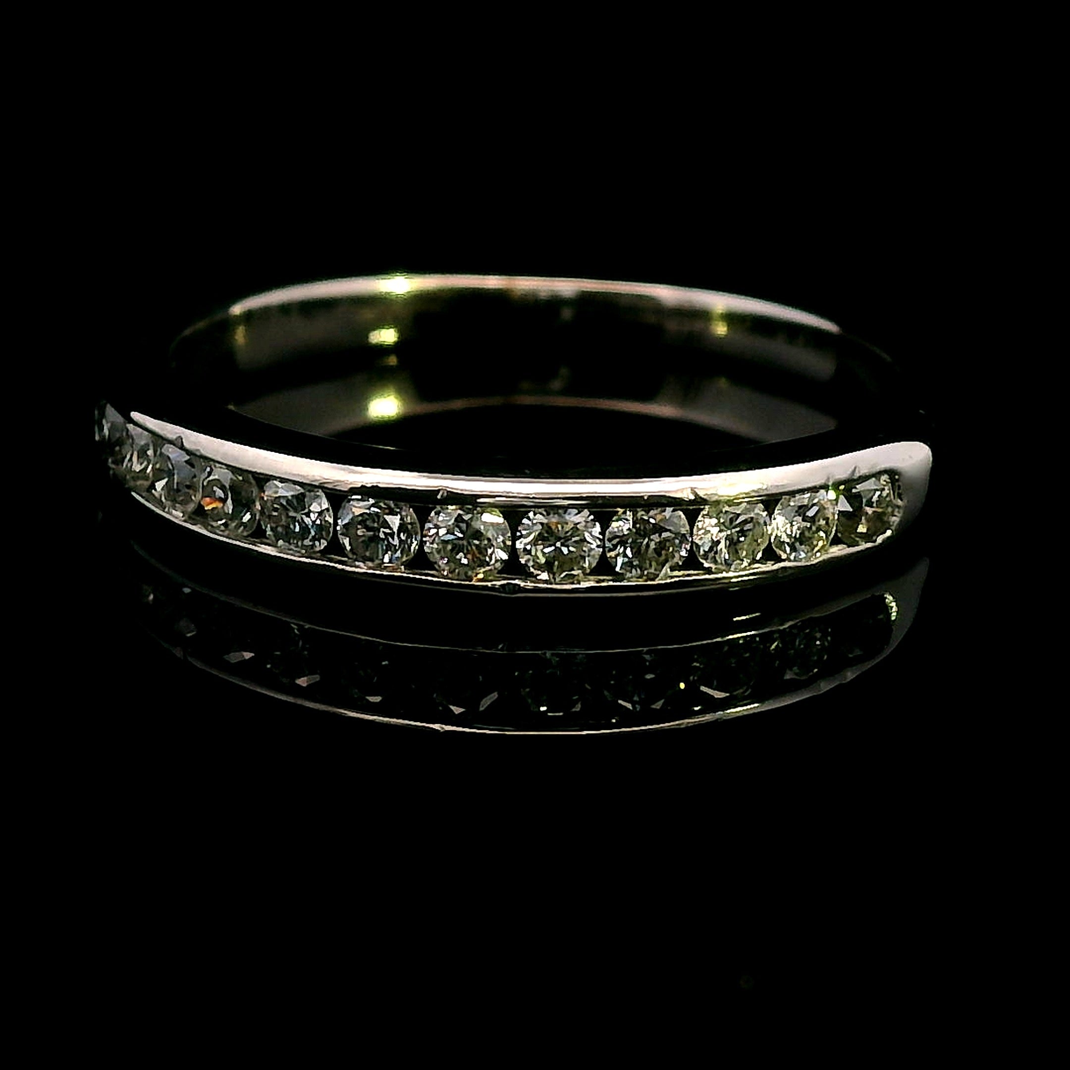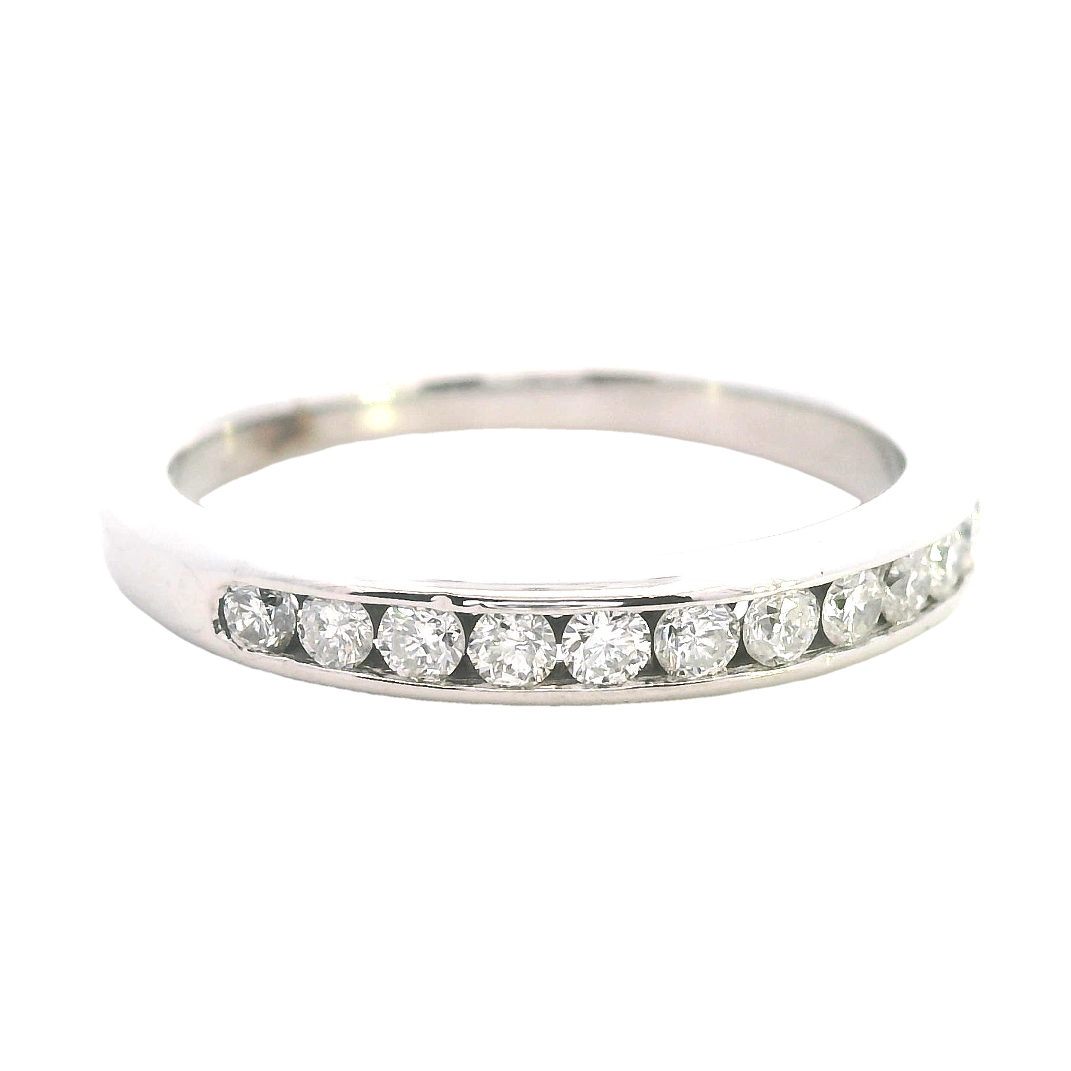 An elegant and refinedΒ 9ct white gold diamond ring, perfect for aΒ wedding band, anniversary gift, or stacking ring. TheΒ 12 dazzling diamondsΒ are channel-set in a sleek and sophisticatedΒ half-round band, making this piece a timeless treasure.