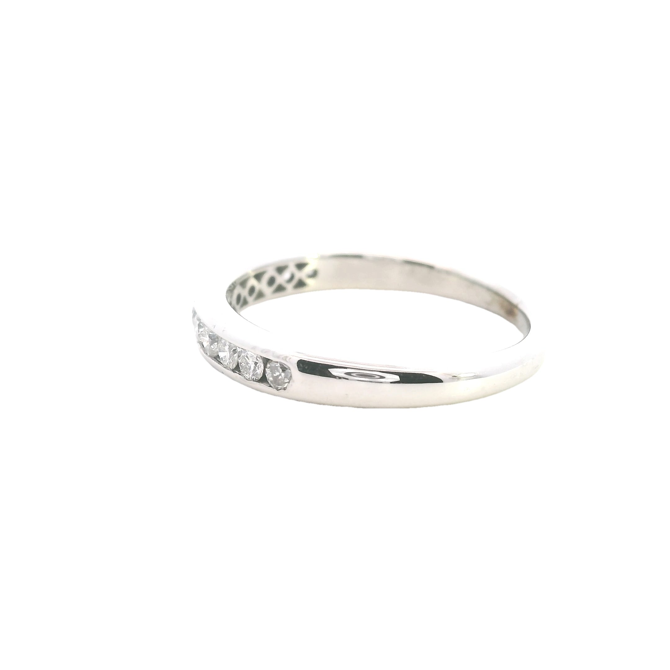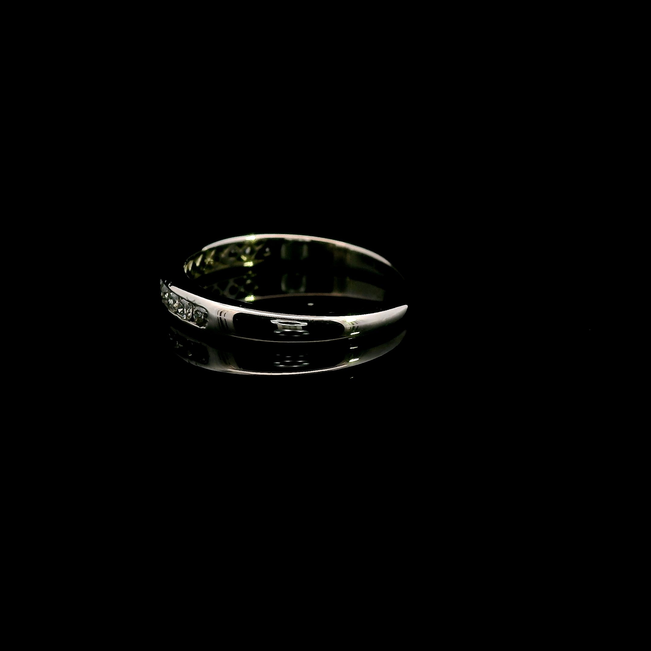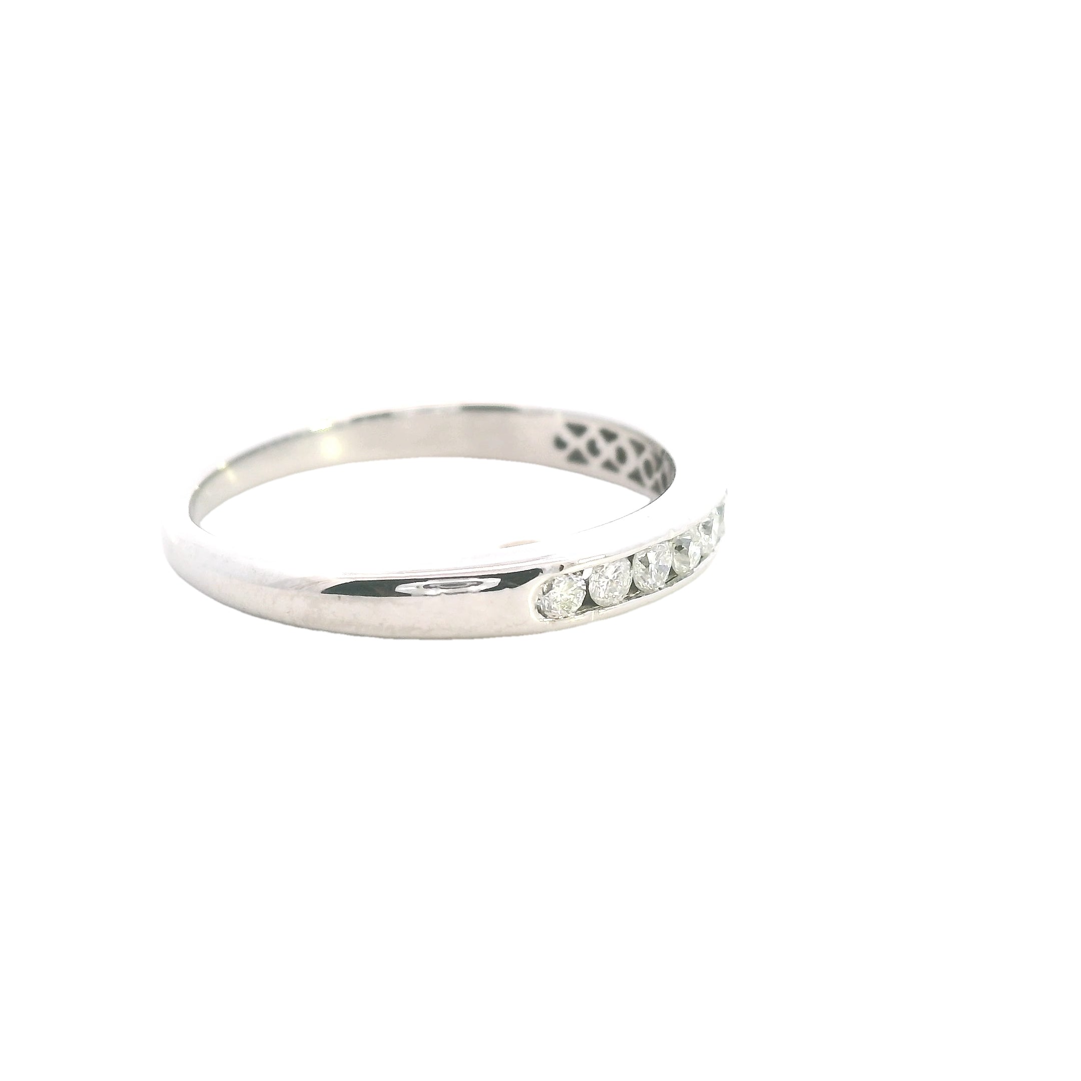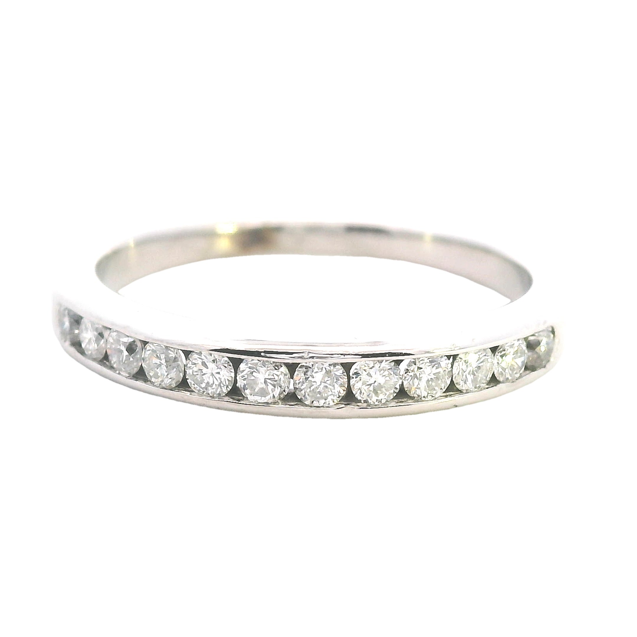 An elegant and refinedΒ 9ct white gold diamond ring, perfect for aΒ wedding band, anniversary gift, or stacking ring. TheΒ 12 dazzling diamondsΒ are channel-set in a sleek and sophisticatedΒ half-round band, making this piece a timeless treasure.